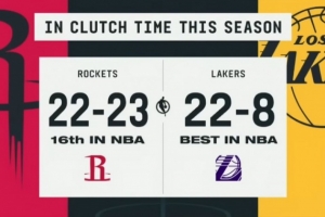 打到关键时刻有戏?湖人本季关键时刻战绩22-8联盟第一 火箭第16